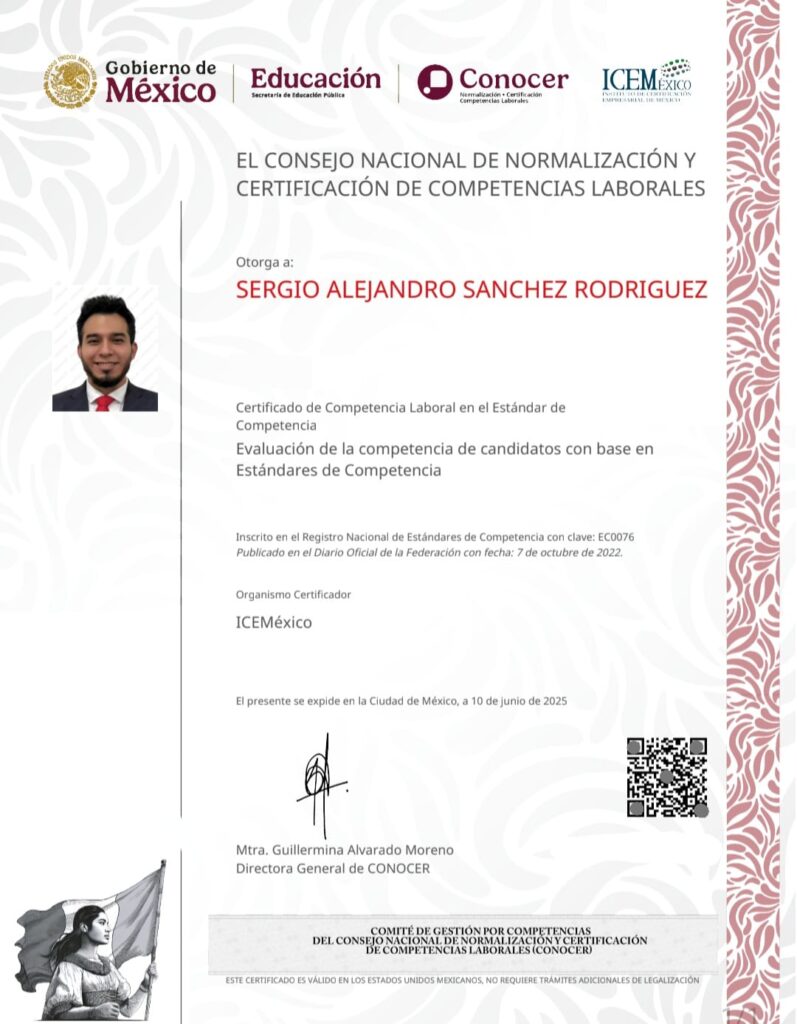 El M. en I. Sergio Sánchez cuenta con la certificación en Evaluación de Competencias de Candidatos con Base en Estándares de Competencias, lo que potencia el desarrollo de las competencias laborares y habilidades de los participantes que se capacitan en Grupo Ingescio. 10 de junio de 2025.
